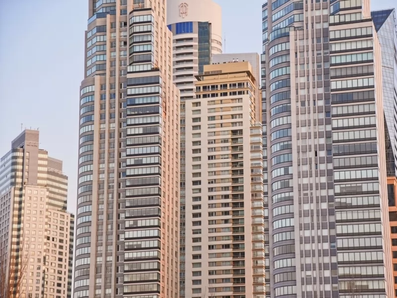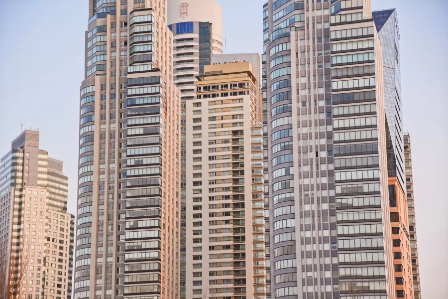 Across the canal is a modern skyline of luxurious residential buildings, forming a picturesque contrast.